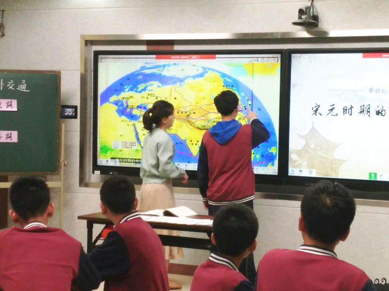 西安交通大学苏州附属初级中学郭炳宏老师与苏州工业园区星澜学校的刘亮老师进行了课堂展示活动。郭老师以《马可·波罗游记》为线索,在课本现有设计结构的基础上,创新架构了《宋元时期的科技与中外交通》一课。此课重在培养学生的时空观念和家国情怀,让学生课堂体验活字印刷术的魅力。在信息技术融合方面,采用了希沃白板、现场视频连线和易加互动平台,充分展现了时代特征。