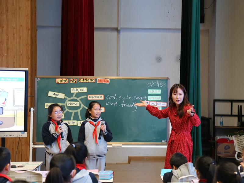 紧接着,张沈逸为大家呈现了一节有趣而扎实的复习课例。张老师通过创设参加“进口博览会”的情境,引领孩子们在探索“科技世界”的同时,将不同的单元复习重点融入其中,在巩固操练中加入趣味游戏与合作对话环节,学生在玩中学,在学中玩。同时,张老师的课堂兼顾“听、说、读、写”,最后呈现写作内容与写作方法,学生从挑选好句到小组分享好句,再到学生自主修改作文并分享交流,不同形式的复习方式都为孩子们的扎实语用构建了巧妙的支架,学生的语言运用能力得到了充分的锻炼。