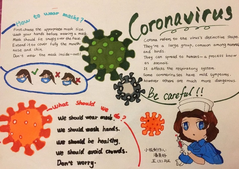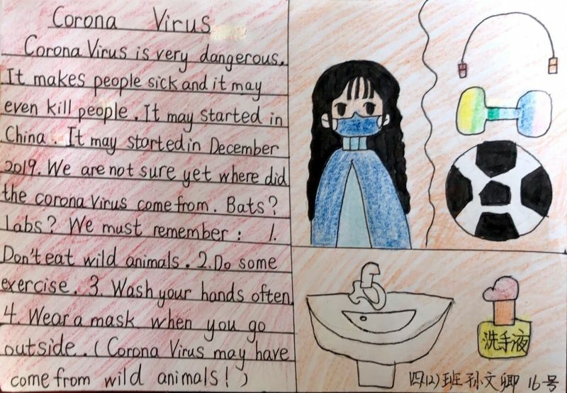 园区外教David制作了一节关于新冠病毒防护的英语微课,他从自我保健与居家防护等方面给孩子们进行了细致的指导。孩子们不仅学到了地道的语言,还巩固了防疫的相关知识。外教线上课后,星湾学校的孩子们围绕疫情期间“自我保健与防护”这一主题,精心绘制了独具特色的抗疫英文小报,并在班级交流,宣传防疫知识。