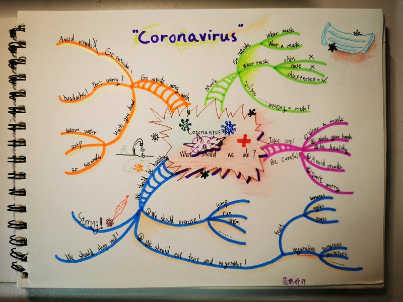 在外教David的线上课程指导下,孩子们绘制的这些海报也充分展示了园区小学英语教学的成果。他们在海报设计中,通过主题发散、问题聚焦、思维导图等方式,思路清晰、层次分明,有效地展示了小学生对疫情的了解和防护知识。还有学生将主题海报和英语写作相结合,介绍了居家防疫的具体措施,充分展示了园区小学生优秀的英语学科核心素养。这些充满才气和创意的作品,流露出园区小学生对英语课程、外教课程的喜爱。