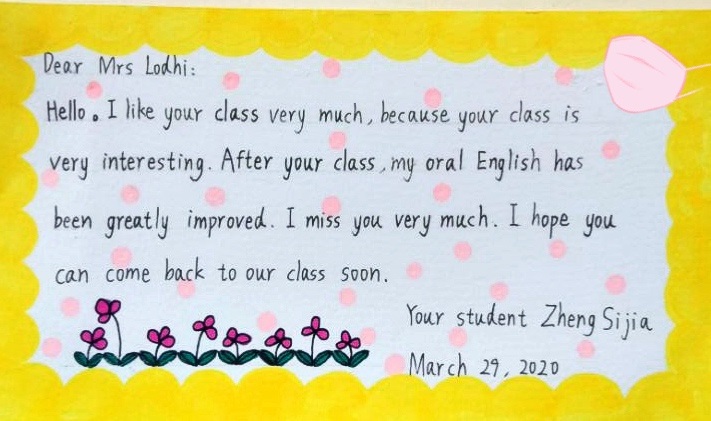 胜浦实验小学的外教Mrs Lohdi来自英国,她居家防疫期间给孩子们带来了好几节优秀的线上微课。这期间,英国疫情严重,学生们担心老师,“鸿雁传书”表达对她的感谢、思念和问候。学生信件被收录在后续外教的微课中,外教老师还给孩子们回信,这让园区的孩子们大受鼓舞。