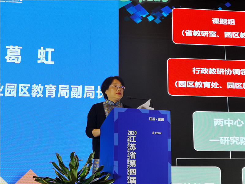 25日上午,在STEM大会开幕式上,园区教育局作为省STEM教育实验区代表向全省作了经验分享。葛虹从生命科学、技术工程、地球宇宙、物质科学和人工智能等五大领域,阐述了园区STEM教育的整体规划布局。她围绕“立德树人、创新载体、科学规划、协调统整、行动聚焦、立足校本、创新文化”八个方面阐明了园区STEM教育的行动计划。葛虹的发言不仅展示了园区近几年来践行“适合的教育”的实践成果与方向,还向与会代表们呈现了园区STEM教育的雄厚基础和区域优势。